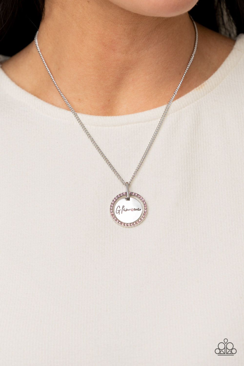 Infused with a silver ring of glassy pink rhinestones, a glistening silver disc is dotted with dainty pink rhinestone and stamped in the word, "Glamma," as it swings below the collar for a glamorously sentimental look. Features an adjustable clasp closure.