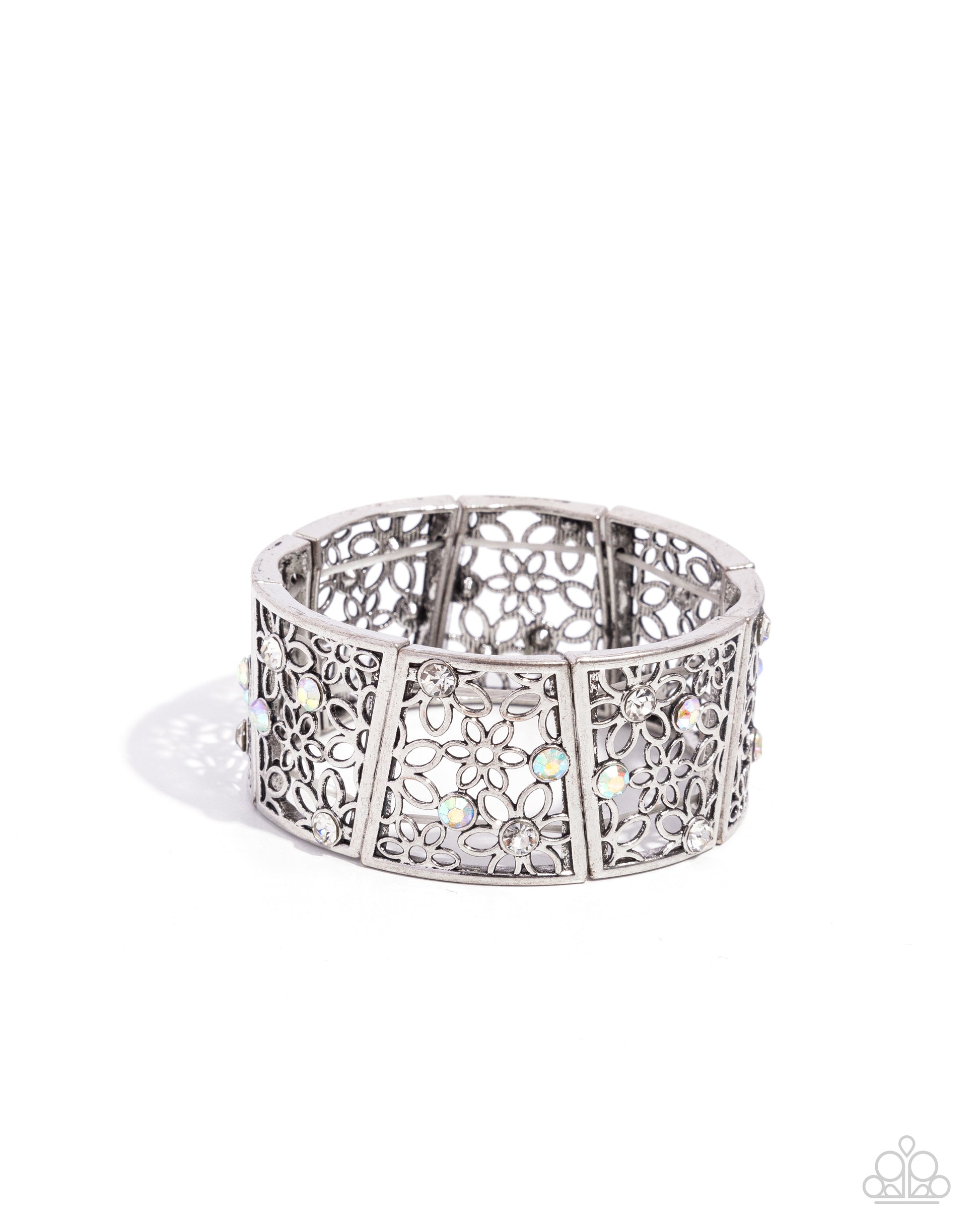 Sporadically dotted with white and iridescent rhinestones, an airy daisy pattern blooms inside trapezoidal silver frames that are threaded along stretchy bands around the wrist for a seasonal statement. Due to its prismatic palette, color may vary.